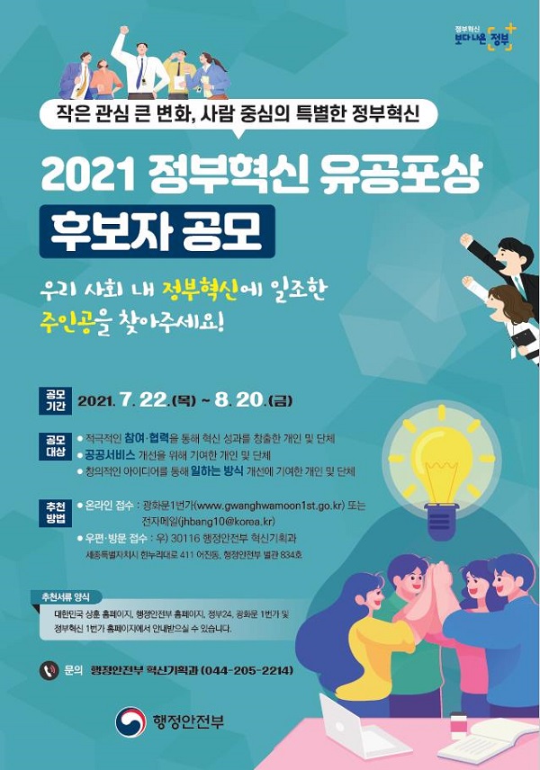 행정안전부는 22일부터 다음달 20일까지 ‘2021년 정부혁신 유공’ 포상 후보자를 공모한다고 21일 밝혔다.